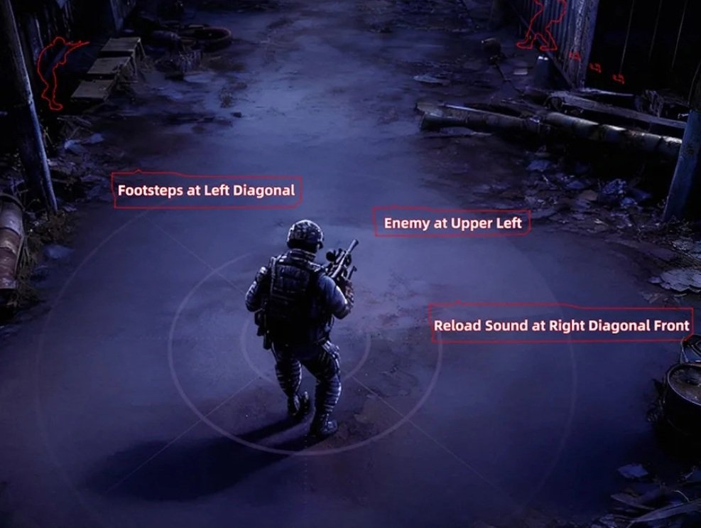 La afinación acústica especializada resalta pasos enemigos en bajas frecuencias y disparos en altas frecuencias, facilitando una identificación exacta de la dirección, distancia y tipo de arma. Cada sonido aporta información clave para anticiparte en combate.